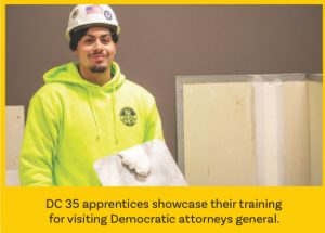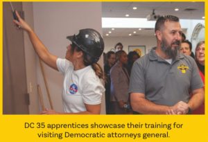 In addition to the wage theft discussion, visiting Attorneys General and their staff, and Progressive State Leaders Committee staff visited with union members and DC 35 apprentices Melissa Schneiderhan, Hull; Melody Williams, Dorchester; Christopher Hernandez from Revere; and Randall Rodericks, Roxbury, who showcased their training with a painting, drywall finishing, and glazing demonstration.