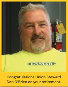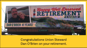 I would like to congratulate Brother Dan O’Brien on his recent retirement. Dan, in addition to installing and servicing billboards for over forty years with Lamar Outdoor in Western Mass, has also served as our Union Steward for over thirty years. I have had the liberty to have Dan on every negotiating committee since 1990. All the best to Dan O’Brien on his retirement and thank you for your dedicated service to our industry and this Union! Dan will join Mike and Paul O’Brien as a retiree from the same company and our Union.